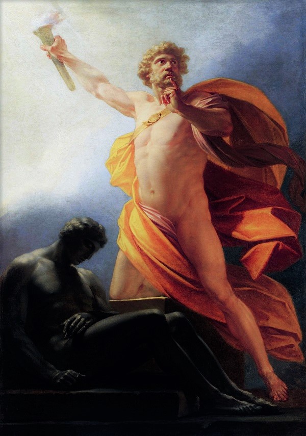 La acción de Prometeo sitúa al ser humano en un mundo asequible y digno. Es un mito que representa el sacrificio de un dios que sufre por beneficiar a los hombres. He aquí, entre los griegos, una faceta que el cristianismo explotará decisivamente en la difusión del mito de su propio Dios. La tragedia de Prometeo subraya el absoluto desinterés que ha movido al dios heroico a favorecer a los mortales[32]. Frente a Cristo, que ha de resucitar triunfante y poderoso de entre muertos y enemigos, Prometeo resulta condenado a un infernal tormento que se pretende eterno, pierde todo su poder, y nunca recuperará ni la fuerza ni los poderes extirpados. La acción de Prometeo ha beneficiado exclusivamente al género humano, y ha permitido su acceso al disfrute sensorial y material de un mundo terreno y placentero.
